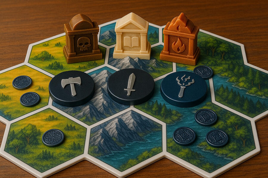 Once the dust has settled, you must choose one of three actions:Summon – Deploy hidden units to the board, keeping your strategy concealed.Slide – Create mystical paths to move your units across the map and gain territory.Sacrifice – Replace a unit with a Shrine to unlock powerful blessings and move one step closer to victory.With just one action each round, every choice in Avarice is fast, deliberate, and deeply tactical. Timing, positioning, and deception are everything.Combat blends the calculated positioning of chess, the deception of hidden units, and the swift resolution of rock-paper-scissors.Each unit type has a unique range, ability, and target it defeats. Forests, Lakes, and Mountains shift the rules of engagement, and special tokens can twist the flow of play.Victory goes to the player who outmaneuvers, outbuilds, and outsmarts their rivals in this fast, tactical 4X game of hidden information and bold decisions.